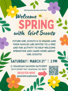 Future Girl Scouts in grades K-12 and their families are invited to a FREE and fun activity to help welcome springtime and learn more about Girl Scouts!